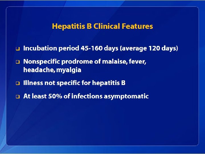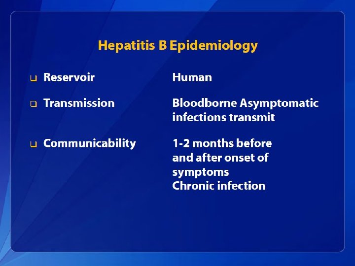 Hepatitis B Epidemiology • The incubation period from the time of exposure to onset of symptoms is 6 weeks to 6 months. • HBV is found in highest concentrations in blood and in lower concentrations in other body fluids (e. g. , semen, vaginal secretions, and wound exudates). • HBV infection can be self-limited or chronic.