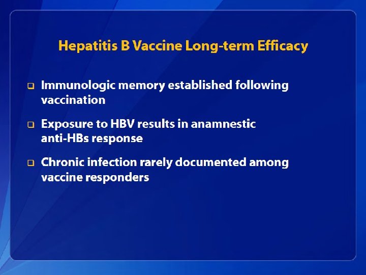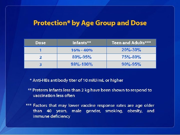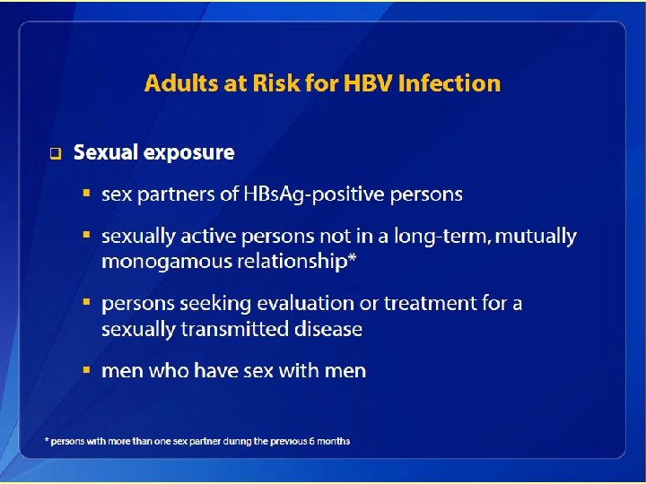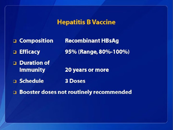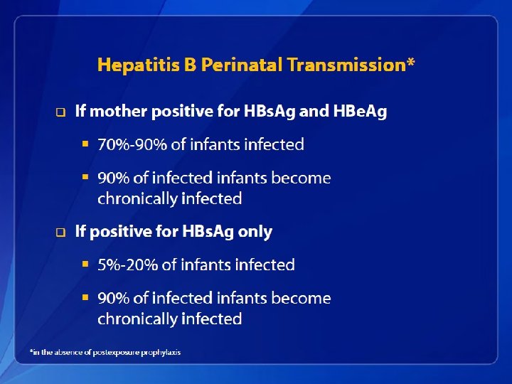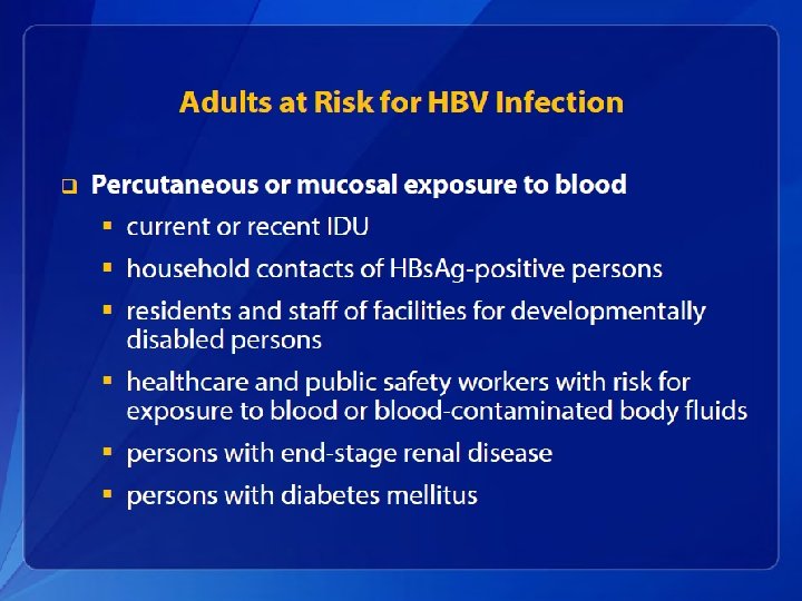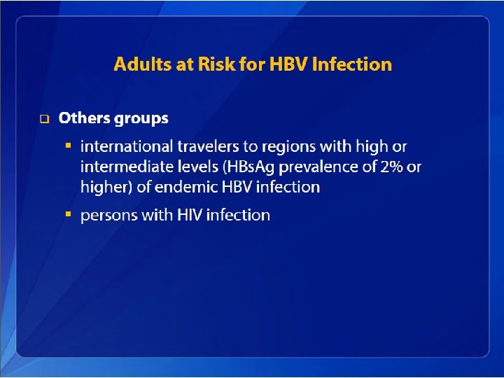 Hepatitis B Elimination • CDC’s national strategy to eliminate transmission of HBV infection includes: – Prevention of perinatal infection through routine screening of all pregnant women for HBs. Ag and immunoprophylaxis of infants born to HBs. Agpositive mothers and infants born to mothers with unknown HBs. Ag status – Routine infant vaccination – Vaccination of previously unvaccinated children and adolescents through age 18 years – Vaccination of previously unvaccinated adults at increased risk for infection