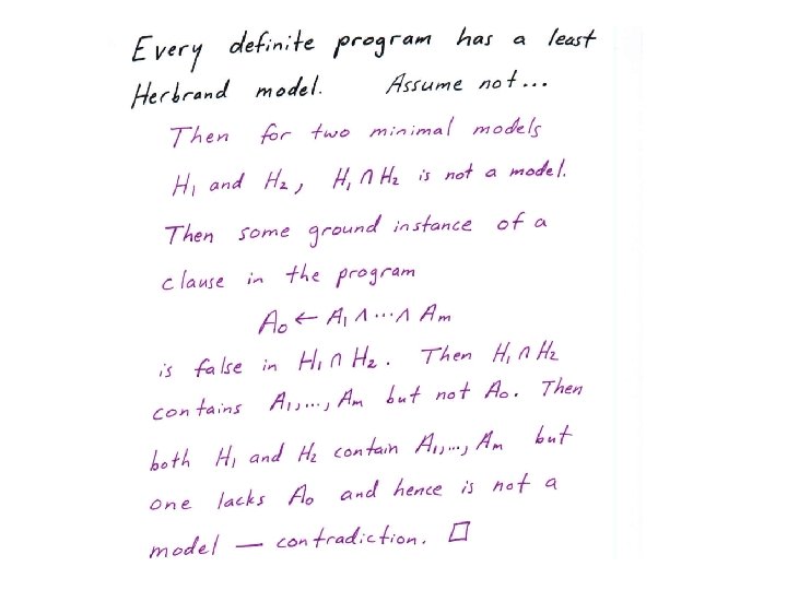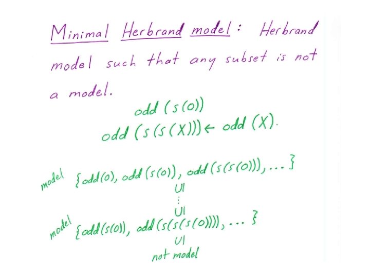 About Least Herbrand Models • The least Herbrand model MP of a program P is the set of all ground atomic logical consequences of the program. • In general it is undecidable whether a ground atomic formula is in the least Herbrand model of a program (logically follows from the program). But if it follows, it can be eventually shown…