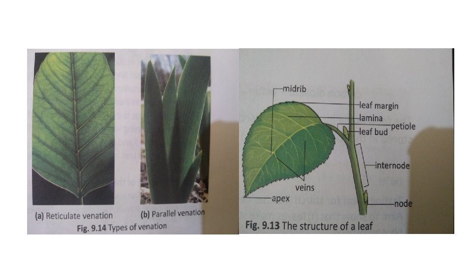 The Leaves • Venation: • The arrangement of veins in the leaf is known as the venation of the leaf. • (i) Reticulate venation: The network of veins in a leaf where all the veins are connected to the midrib at different points is known as Reticulate venation. e. g Mango, Jackfruit etc. • (ii) Parallel Venation: The network of veins in a leaf where all the veins run parallel to each other is known as Parallel Venation. e. g. Banana, Grass, Maize etc. • Note: • (i) Reticulate venation is seen in the leaves of plants that have Taproot. • (ii) Parallel venation is seen in the leaves of plants that have Fibrous root.