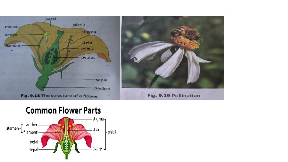 The flower • The flower is often the most attractive part of a plant. Some flowers have pleasant smell. The Colours and Scent of a flower help it to carry out its main function, namely, reproduction. • (i) Pedicel: The stalk of a flower is called pedicel. It has a swollen end to which the other parts of the flower are attached in layers. • (ii) Sepals: The outermost layer consists of small, green, leaf-like structures called Sepals. The sepals cover and protect the flower when it is a bud. • (iii) Petals: The colourful parts of a flower are called Petals are present inside the sepals.