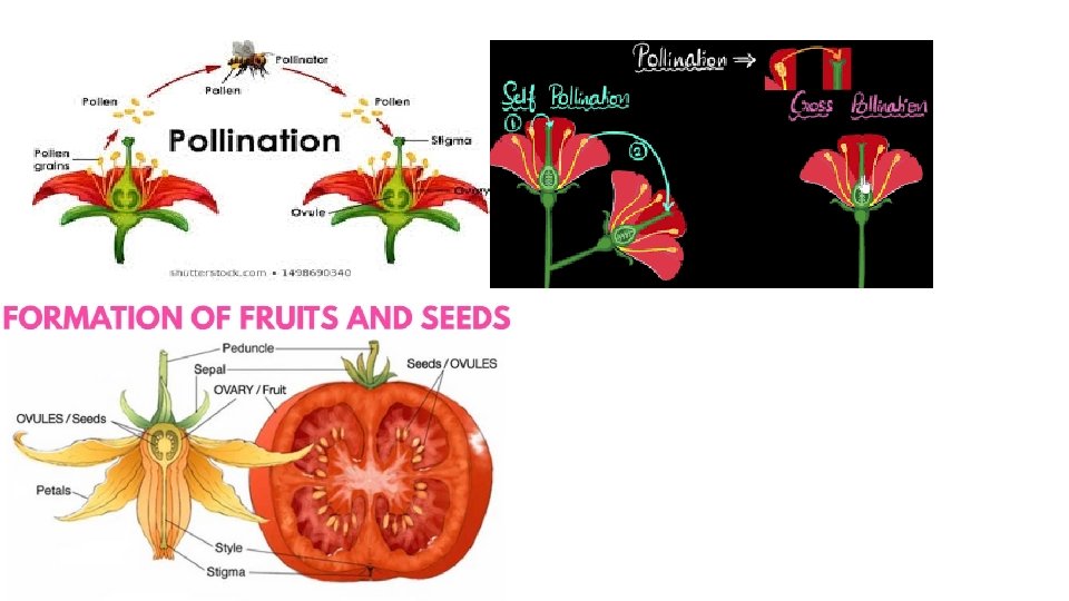Pollination: • Pollination: The transfer of pollen grains from the anther to the stigma is called Pollination. • (I) Self-Pollination: The pollination in which the pollen grains are transferred from the anther to the stigma of the same flower or another flower of the same plant is known as self-pollination. • (ii) Cross-Pollination: The pollination in which the pollen grains are transferred from the anther of one flower in one plant to the stigma of another flower in another plant of same kind is known as Cross. Pollination. • Fruit Formation: After pollination, the ovules develop and become seeds. The sepals, petals and stamens fall off. The ovary starts to store food and swells up to form the fruit. The fruit protects the seeds and helps in their dispersal. Fruits may be fleshy or dry, they may have one seed or many seeds. Under favorable conditions, the seed germinates into a seedling.