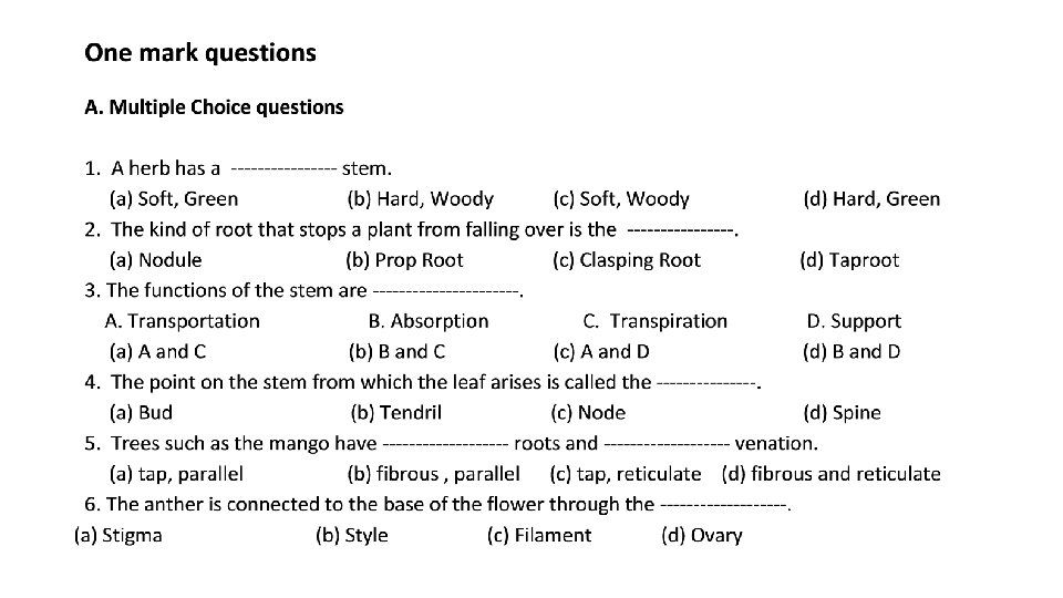 Five marks questions 1. Describe two different kinds of root systems. 2. How will you show that roots absorb water and transport it up the stem? 3. Describe different stem modifications seen in plants. 4. Explain the functions of leaf. 5. Describe the structure of a flower with a neatly labeled diagram. 6. Draw a neatly labeled diagram of a leaf. 7. What is pollination? Why is it necessary? 8. What is Pollination? What are Self Pollination and Cross pollination?