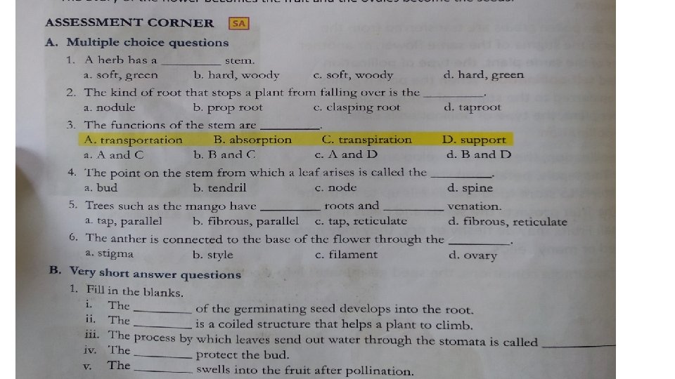B. Very Short answer Questions 1. Fill in the blanks (i) The ---------- of the germinating seed develops into the root. (ii) The --------- is a coiled structure that helps a plant to climb. (iii) The process by which leaves send out water through the stomata is called ------(iv) The ------ protect the bud (v) The ------- swells into the fruit after pollination. • Place the words in the correct column. Water, Carbon-di-oxide, Energy, Oxygen, Food, Sunlight Process Photosynthesis Respiration What is needed What is formed