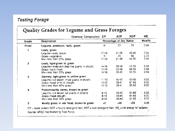 Substituting grass for alfalfa in fresh cows Forage CP NDFD NFC % of dry matter Corn silage 9 41 68 27. 5 Alfalfa 20 40 48 27. 5 Orchardgrass 16 60 60 11. 5