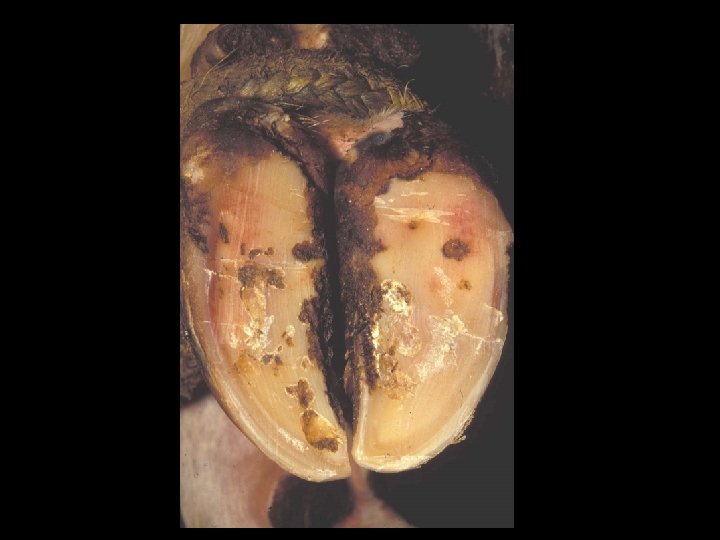 Diseases of the hoof horn • Laminitis – inflammation of the laminar corium, founder • Sole hemorrhage, sole ulcer (Rusterholz ulcer), under-run sole • White line disease – separation of the laminar corium • Heel erosion – slurry foot • Double sole