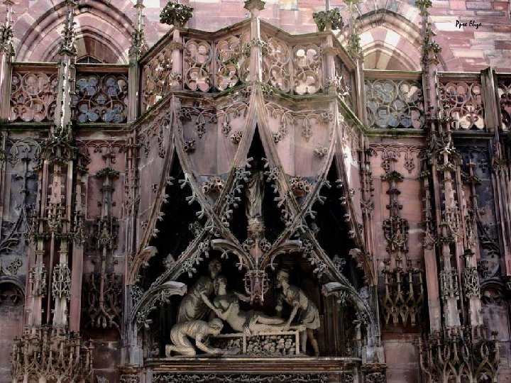 La catedral de Estrasburgo se inició en el final del siglo XII. Como en muchos otros edificios europeos, se puso debajo una base de roble La fachada es magnífica, de gótico radiante, de Erwin Steinbach. Asombra su vigor vertical, sus airosas lancetas y su estatuaria. Con magníficas escenas bíblicas. En la portada derecha está la famosa escena del seductor de vírgenes necias. La torre es altísima. Se trata de la torre catedralicia más alta del mundo, hasta que en el final del XIX le arrebató el título la catedral de Colonia. El interior es bello, pero sencillo. Destaca el pilar de los ángeles, en el brazo derecho del crucero; las excelentes vidrieras del XII al XIV, y el típico reloj astronómico, del XIX, muy explicado por los guías turísticos, donde la muerte marca las horas