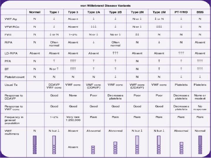 v. WD • Type 2 ; 15 -20% have type 2 disease • • • ; variant of the disease with primarily qualitative defects of VWF Type 2 A VWD Type 2 B VWD Type 2 M VWD Type 2 N VWD Type 3 ; most severe form of VWD marked deficiencies of both VWF and FVIIIc the absence of VWF from both platelets and endothelial cells lack of response to DDAVP
