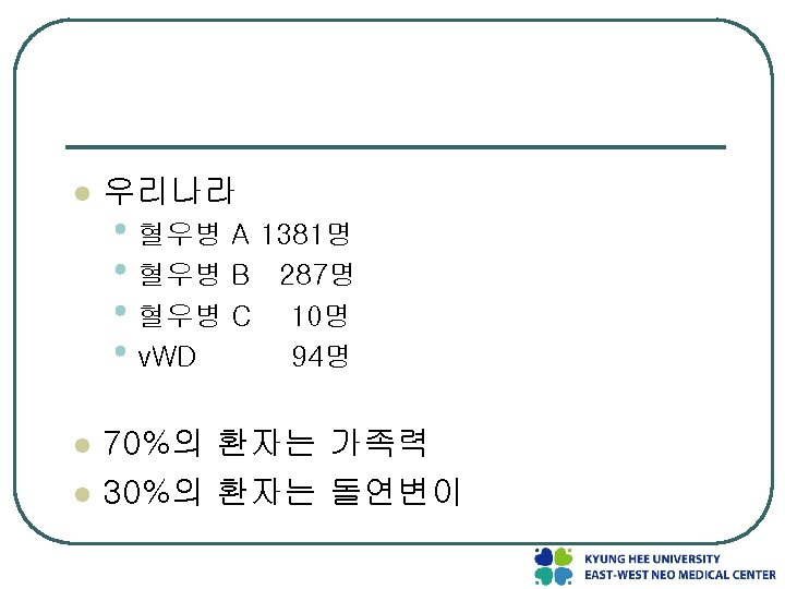 v. WD l l 가성혈우병 the most common coagulation disorder present in 1% of the population autosomal inheritance menorrhagia ; major symptom