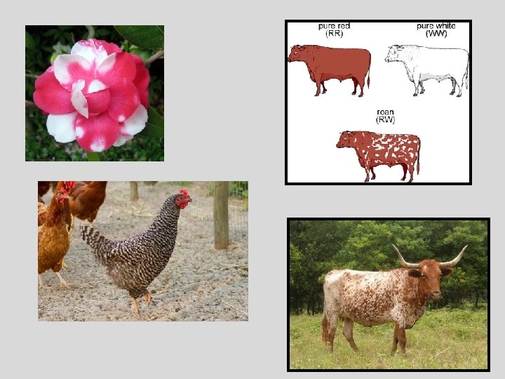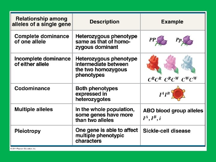 Codominance: phenotype of both alleles is expressed • Eg. red hair x white hairs = roan horses Multiple Alleles: gene has 2+ alleles • Eg. human ABO blood groups • Alleles = IA, IB, I • IA, IB = Codominant • ii = recessive