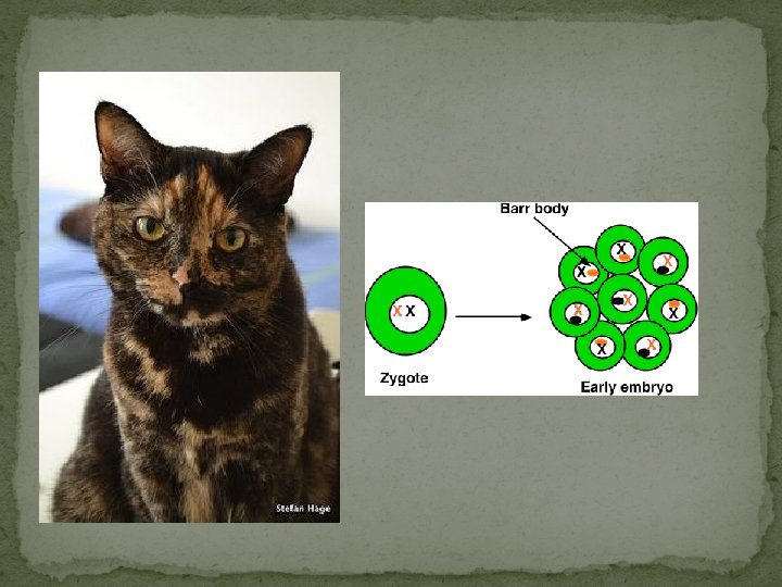 Barr Bodies (Page 291 Edition 10) � Females do not make twice the number of proteins encoded by genes on the X chromosome because they have two � During fetal development, somatic cells shut off one X chromosome. � Different cells shut off the X chromosome at random, so some cells might express the genetic code contributed from the mother and some from the father. � However, once the X chromosome is shut off, all of the offspring from those original cells share the same inactive copy. � Inactive X= Barr Body � Random and Independent Process � Mosaic
