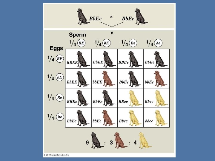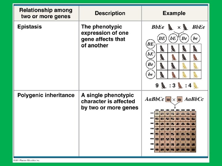 Epistasis �The phenotypic expression of a gene at one locus alters a gene at a second locus �Labrador Retrievers: Black coat color (B) is dominant to brown (bb) Dominant allele (E) determines if the pigment will be deposited in their hair ee = golden lab Regardless if they have a B or b