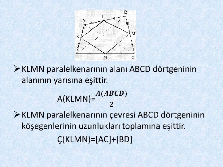 8) Dörtgenlerde kenarların orta noktalarının birleştirilmesiyle oluşan şekil paralelkenardır. Ø Dörtgenin köşegenleri dik kesişiyor ise KLMN bir Dikdörtgendir. Ø Dörtgenin köşegen uzunlukları birbirine eşit ise KLMN Eşkenar dörtgendir. Ø Dörtgenin köşegenleri dik kesişiyor ve uzunlukları birbirine eşit ise KLMN Karedir.