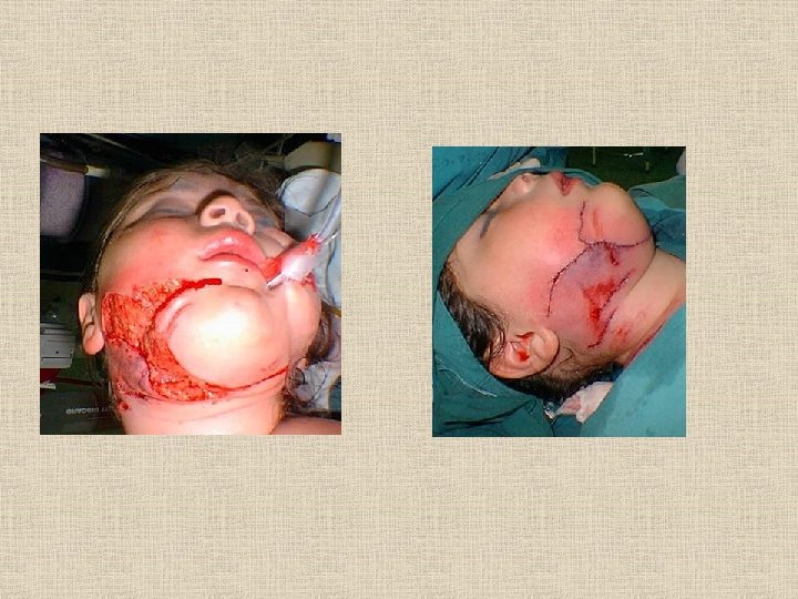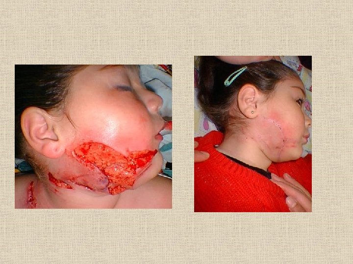 Mordedura de perro facial Anestesia general Recordar que colmillo forma bolsillos que hay que lavar con ABUNDANTE suero fisiológico antes de suturar Steri-strip complementando sutura intradérmica
