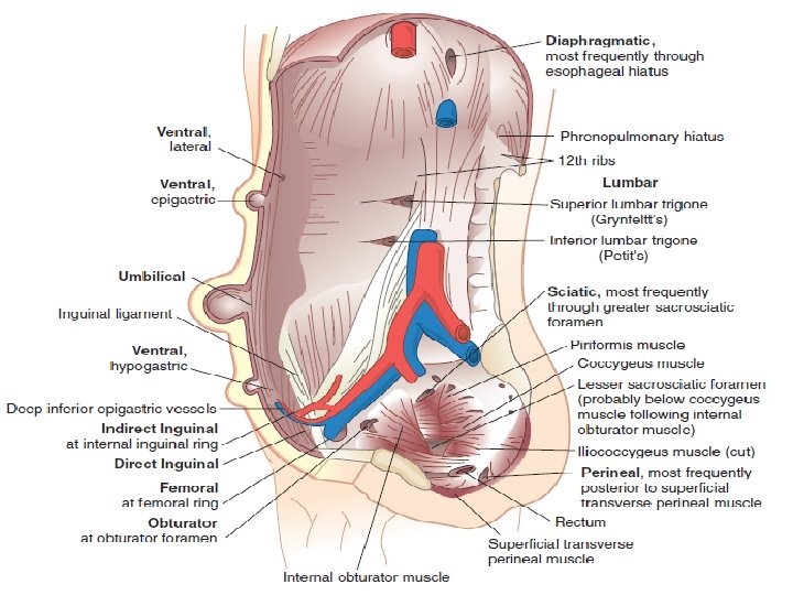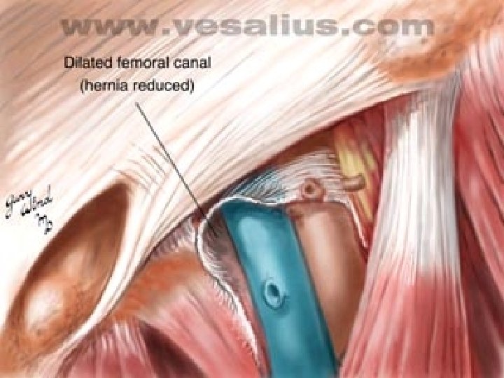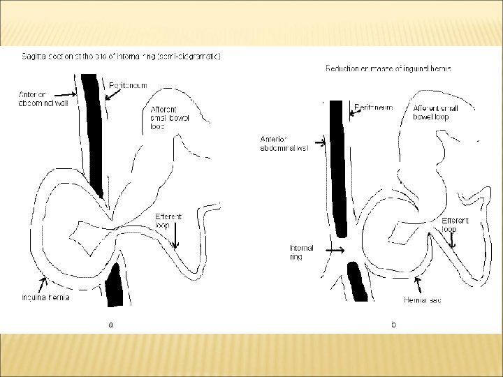 CLINICAL TYPES , CONTINUED… incarcerated hernia: is one whose contents cannot be returned to the abdomen, with severe symptoms. strangulated hernia: denotes compromise to the blood supply of the contents of the sac. incarcerated hernia and strangulated hernia are the two stages of a pathologic course Richter’s hernia (intestinal wall hernia ) a hernia that has strangulated or incarcerated a part of the intestinal wall without compromising the lumen. Sliding hernia is one in which the wall of a viscus forms a portion of the wall of the hernia sac. It is may be colon ( on the left), caccum (on the right) or bladder (on either side). Belongs to irreducible hernia Littre hernia: a hernia that has incarcerated the intestinal diverticulum (usually Meckel diverticulum).