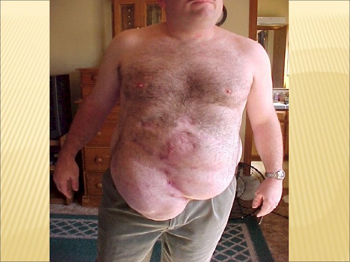 EPIGASTRIC HERNIA Occurring between the navel and the lower part of the rib cage in the midline of the abdomen, these hernias are composed usually of fatty tissue and rarely contain intestine. Ø Men > Women Ø these hernias are often painless and unable to be pushed back into the abdomen when first discovered. Ø