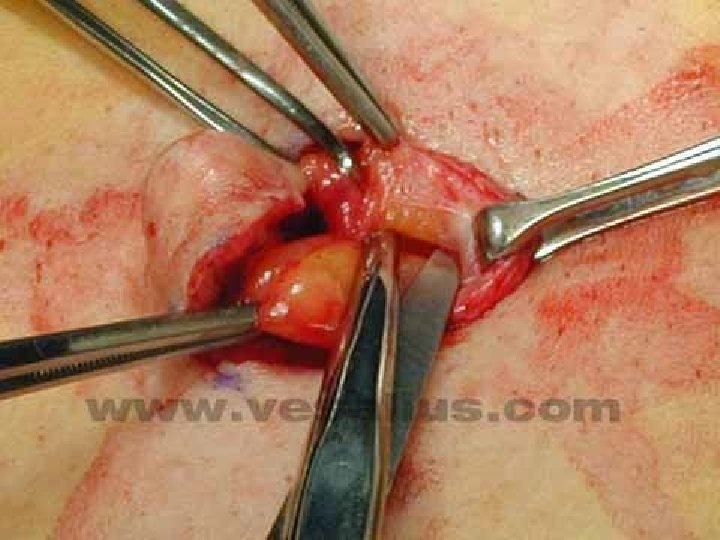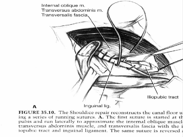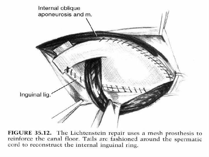 REPAIR Bring together fresh fascial edges after trimming sac Clean off fascial edges at least 1 cm back Close with interrupted or continuous sutures Even with careful technique recurrence rates as high as 50% have been reported
