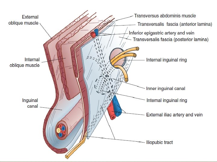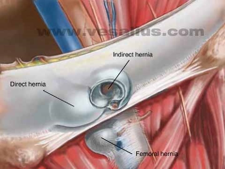 CLINICAL TYPES OF INGUINAL HERNIA indirect inguinal hernia: the internal inguinal ring the inguinal canal external inguinal ring scrotum Ø direct inguinal hernia: Hesselbach’s triangle Ø Pantaloon type Ø