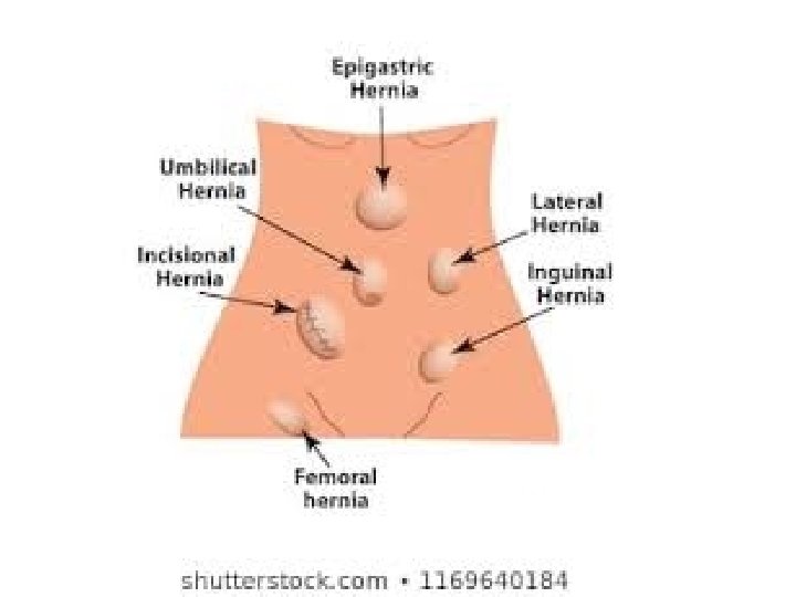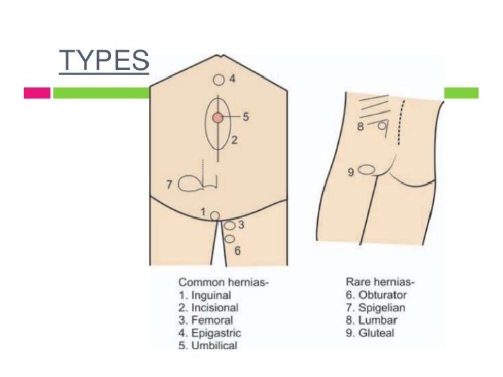 Types • Common – – Groin (Inguinal and femoral) – 75% Incisional – 10% Umbilical - 3% epigastric • Rare – – – Obturator Spigelian Gluteal Lumber Diaphragmatic