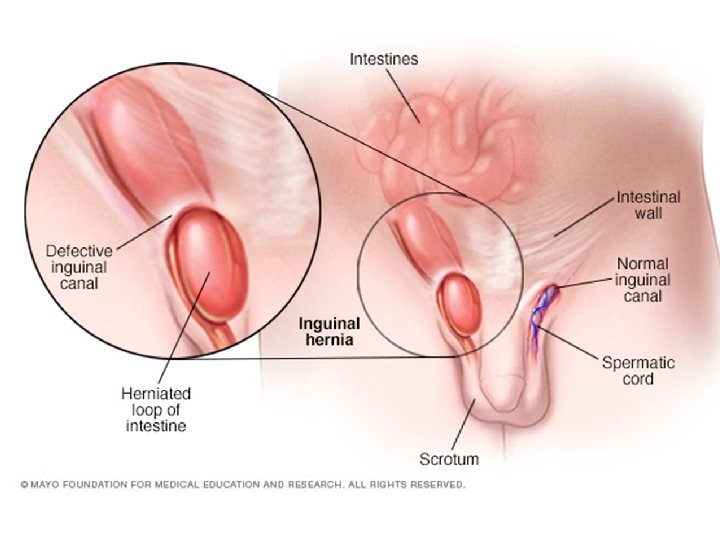Conclusion • Treatment of a hernia depends on whether it is reducible or irreducible and possibly strangulated. – Reducible • Can be treated with surgery but does not have to be. – Irreducible • All acutely irreducible hernias need emergency treatment because of the risk of strangulation. • An attempt to push the hernia back can be made – Strangulation • Operation
