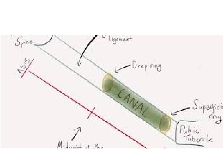 Anatomy continued: • Extends from the anterior superior iliac spine to the pubic tubercle. • About 2 -3 cm in length • It has an internal opening the deep ring and external opening the external ring. • It has a roof, floor, anterior and posterior wall.