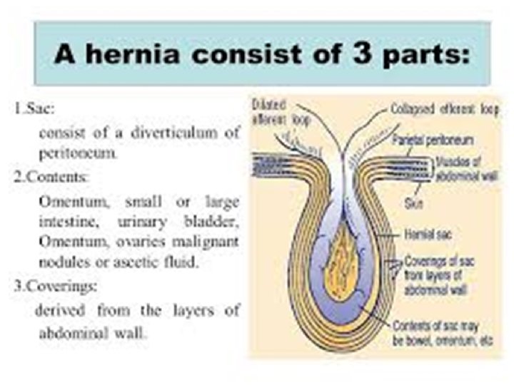 Contents of a Hernia Sac – Omentum: Omentocoele (synonym - epiplocoele). – Intestine: Enterocoele: more commonly small bowel but may be large intestine or appendix - Amyand’s hernia – A portion of the circumference of the intestine - Richter hernia – A portion of the bladder (or a diverticulum) may constitute part of the wall or the sole content - a sliding hernia – – – Ovary with or without the corresponding fallopian tube A Meckel’s diverticulum - A Littre’s hernia Fluid or part of ascitis