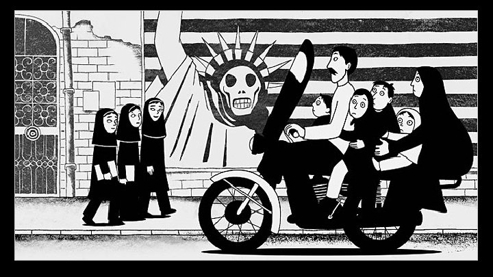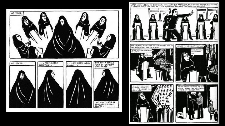 What are the heroes and villains Marjane Satrapi is representing and dealing with in her work?