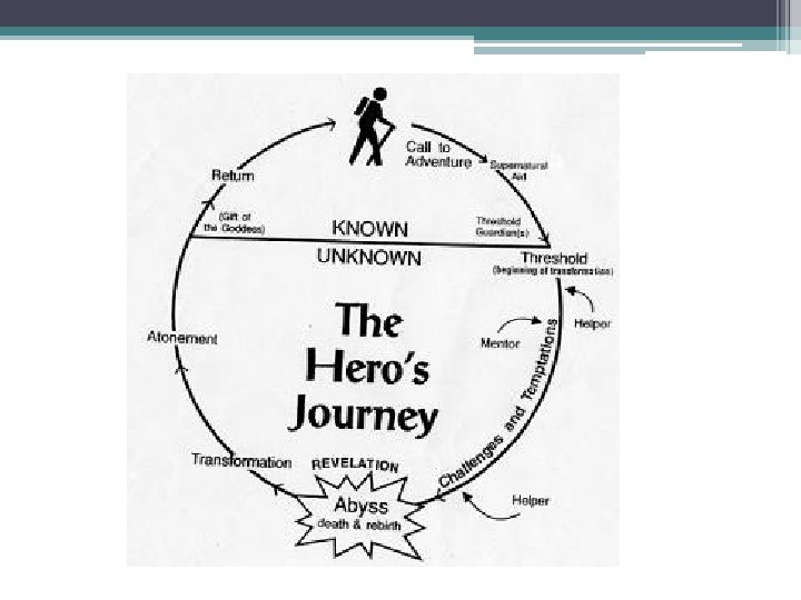 The Pattern 1. Call to Adventure – Usually a divine being brings a message to the hero in his everyday life. 2. Threshold – The hero embarks on his journey leaving everything familiar behind. 3. Challenges – The hero faces a series of obstacles. He often needs help from his supernatural mentor to complete the tasks.