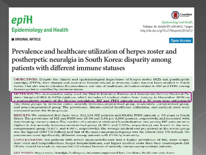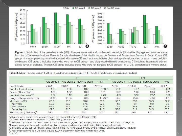 Livengood JM. Curr Rev Pain 2000; 2: 7 -11 Psychosocial stress ↑ ☞ HZ & PHN ↑ Schmander et al. J Am Geriatr Soc. 1990; 38: 1188 -1194 Stressful life events and the status of spousal relationships between 101 individuals with HZ and 101 healthy controls ☞ negative lifeal. events results Immun. in participants with HZ Irwin et Brain Behav 2011’ 25: 759 -766 Depression may blunt the imune response and increase the risk and perhaps severity of HZ
