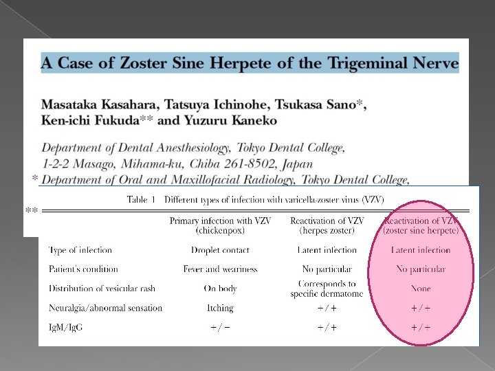 VZV : chickenpox & zoster Herpes simplex virus : type 1 & 2 � VZV & HSVs : subfamily alpha herpes virinae of the herpes virus group � Primary VZV infection (leading to to chickenpox nucleic acids of VZV)→ remain latent in sensory ganglia : lasts for several decades before VZV reactivation �