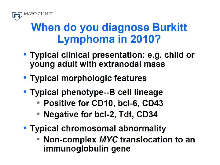 The tumor consists of sheets of a monotonous (i. e. similar in size and morphology) population of medium size lymphoid cells with high proliferative activity and apoptotic activity. The "starry sky" appearance seen[5] under low power is due to scattered tingible body-laden macrophages (macrophages containing dead body of apoptotic tumor cells). The old descriptive term of "small non-cleaved cell" is misleading. The tumor cells are mostly medium in size (i. e. tumor nuclei size similar to that of histiocytes or endothelial cells. "Small non-cleaved cells" are compared to "large non-cleaved cells" of normal germinal center lymphocytes. Tumor cells possess small amount of basophilic cytoplasm. The cellular outline usually appears squared off. Immunohistochemistry The tumor cells in Burkitt lymphoma generally strongly express markers of B cell differentiation (CD 20, CD 22, CD 19) as well as CD 10, and BCL 6. The tumour cells are generally negative for BCL 2 and Td. T. The high mitotic activity of Burkitt lymphoma is confirmed by nearly 100% of the cells staining positive for Ki 67. Genetics All types of Burkitt's lymphoma are characterized by disregulation of the c-myc gene by one of three chromosomal translocations. [7] This gene is found at 8 q 24. The most common variant is t(8; 14)(q 24; q 32), which accounts for approximately 85%[7] of cases. This involves c-myc and IGH@. A variant of this, a three-way translocation, t(8; 14; 18), has also been identified. [8] A rare variant is at t(2; 8)(p 12; q 24). [9] This involves IGK@ and c-myc. Another rare variant is t(8; 22)(q 24; q 11). [9] This involves IGL@ and c-myc. Combined, the two less-common translocations, t(2; 8)(p 12; q 24) and t(8; 22)(q 24; q 11), account for the remaining 15% of cases not due to the t(8; 14)(q 24; q 32) translocation. [7]