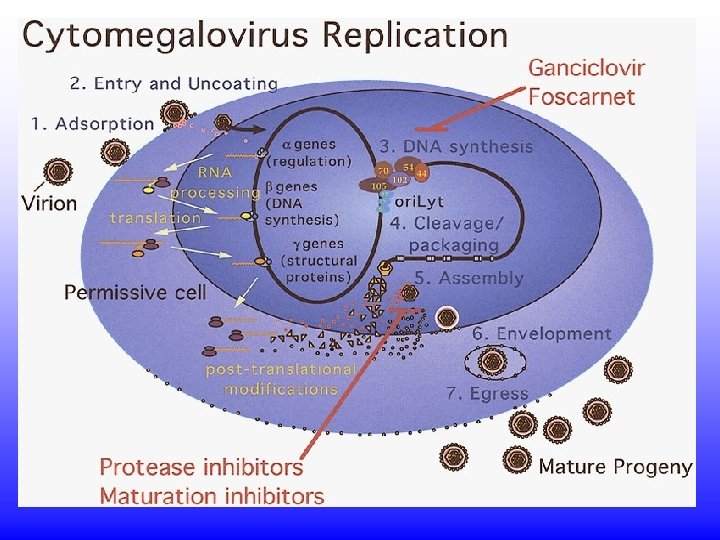 CMV Tratamento: - acyclovir : não muito eficaz - ganciclovir (em pneumonias e retinites) - foscarnet (retinites): inibidor da DNA polimerase viral