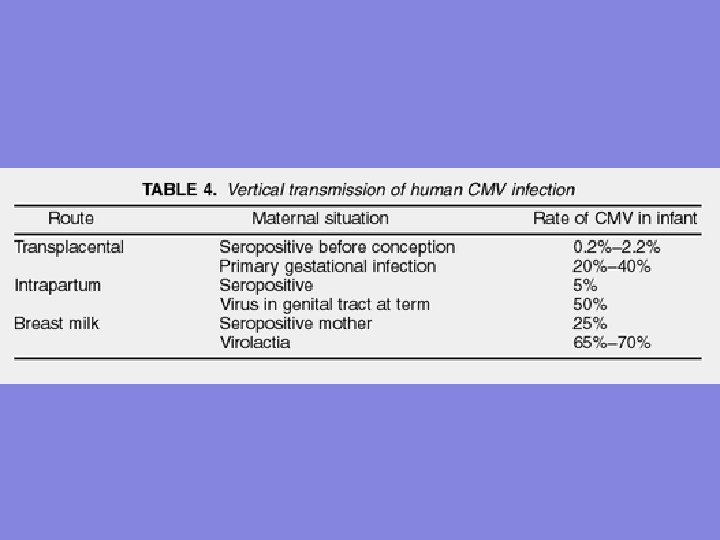 CMV Infecção intrauterina ou pré-natal Achados clínicos: - microcefalia - convulsões - icterícia - hepatosplenomegalia - retardo mental - surdez (mais comum)