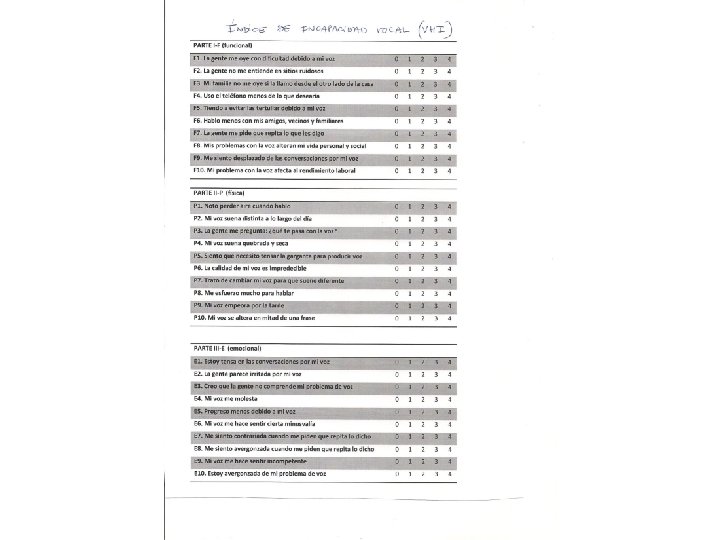 Evaluación en disfonías 2. Índice de Incapacidad Vocal (VHI) (Señeris y otros, 2006) Parte I-F (funcional) Parte II-P (física) Parte III-E (emocional) Prof. Jorge Jiménez Rodríguez