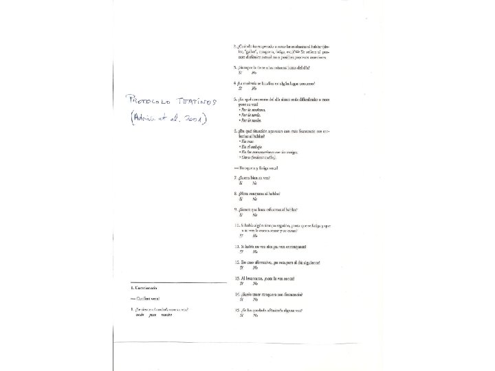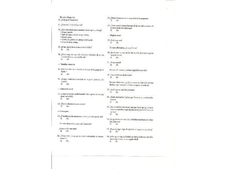Evaluación en disfonías 2. Índice de Incapacidad Vocal (VHI) (Señeris y otros, 2006) Las siguientes afirmaciones han sido usadas por muchos pacientes para describir sus voces y los efectos de sus alteraciones en la vida diaria. Marque con un círculo la respuesta que indica que usted tiene la misma experiencia. 0: nunca 1: casi nunca 2: a veces 3: casi siempre 4: siempre Prof. Jorge Jiménez Rodríguez