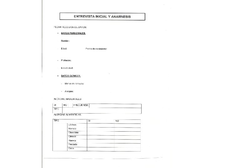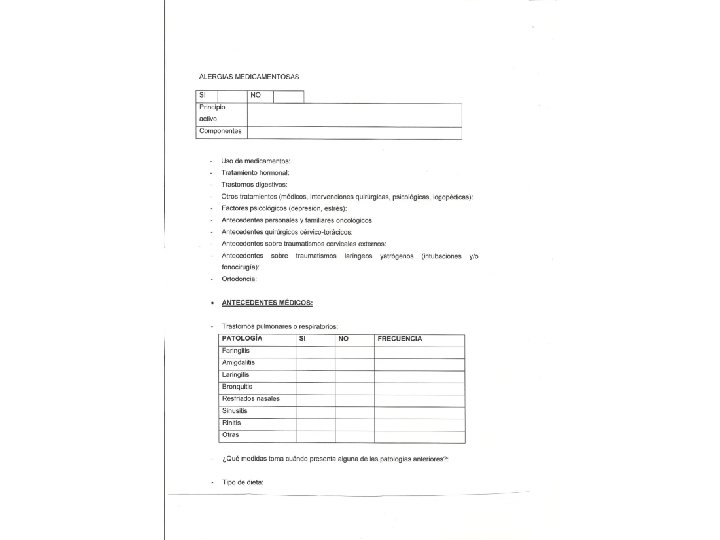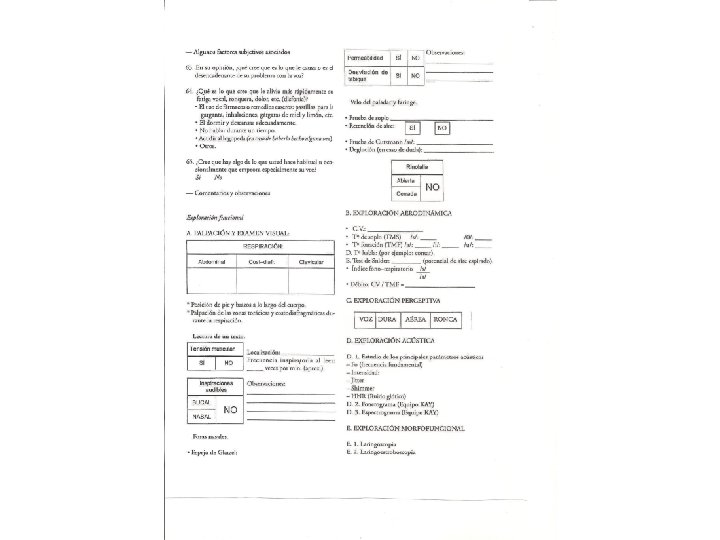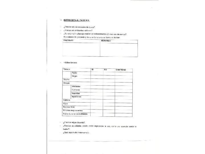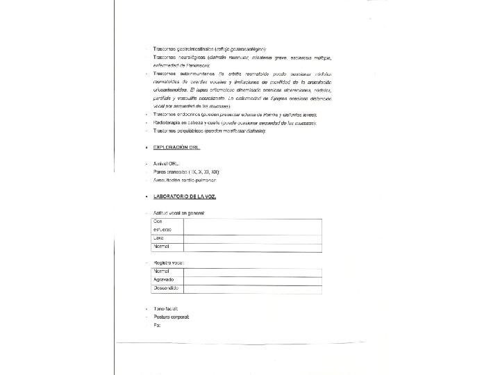 Evaluación en disfonías 1. Entrevista inicial y anamnesis Datos personales Datos clínicos: alergias (ambientales, alimenticias, medicamentos) • Antecedentes médicos: patologías, dietas. • Exploración ORL • Laboratorio de la voz • • Prof. Jorge Jiménez Rodríguez