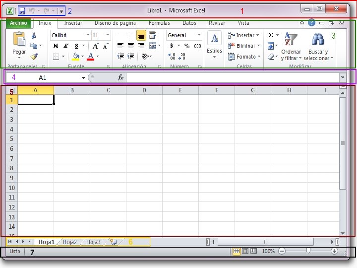 Descripción de la pantalla de Excel. Básicamente la pantalla de Excel está dividida en 7 zonas (Ilustración 2): Barra de Título: indica el nombre del documento. Barra de herramientas de acceso Rápido, programable para agregar comandos personalizados. Barra de Menús y herramientas: agrupa las herramientas más comúnmente usadas en categorías. Barra de Referencia y función: indica en qué posición está la selección y si contiene una función o fórmula. Zona de trabajo: cada una de las zonas delimitadas se llaman celdas y se les asocia una coordenada, primero una letra (columna) y un número (fila). Barra de hojas: indica en que hoja se está trabajando permite moverse entre ellas. Barra de Estado: permite ver si están realizadas las operaciones, además de contener botones rápidos para facilitar la visualización