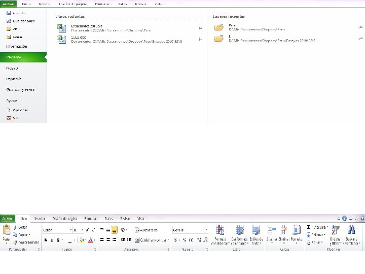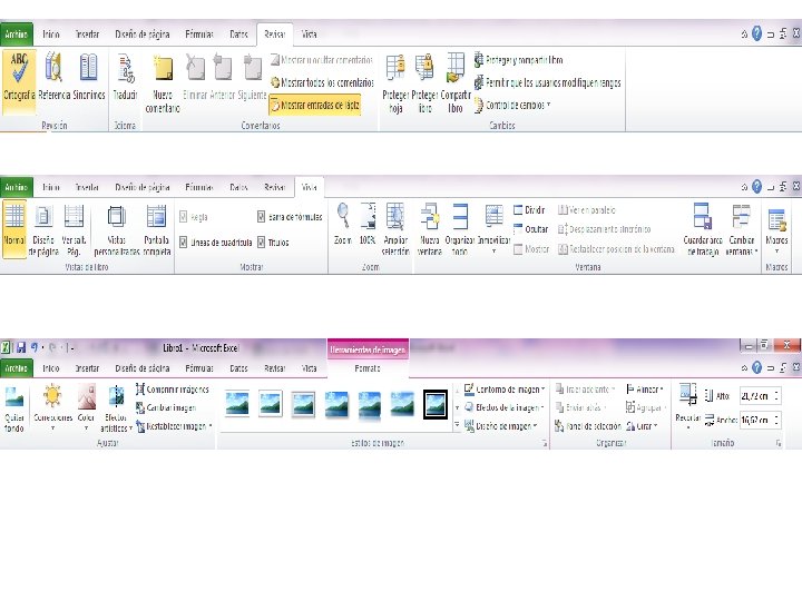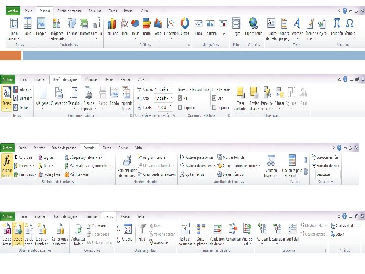 Barra menús y herramientas. Barra Archivo: incluye las funciones más comunes para abrir guardar y trabajar con las propiedades de nuestro archivo. Barra Inicio: incluye las funciones más comunes, como formato de texto y estilos, además de otras opciones. Barra Insertar: básicamente engloba todas las posibilidades de incorporar contenido a nuestra hoja de calculo, desde imágenes, tablas, vínculos, ecuaciones, etc. Barra Diseño de página: Permite diseñar la forma y el tamaño de la hoja, entre otras opciones. Barra Fórmulas: organiza las funciones Excel y permite utilizar herramientas sobre ellas. Barra datos: Permite realizar importaciones, y ordenar los datos desde casi cualquier fuente. Barra Revisar: Permite revisar por un usuario que la hoja esta correcta, tanto semántica, gramática como lógicamente; además permite la revisión entre distintos usuarios y la protección de la hoja. Barra Vista: Permite escoger queremos ver y como queremos verlo. Otras barras: Se agregan como complementos, o al seleccionar un tipo de añadido estas aparecen en demanda, como la barra de herramienta imágenes.
