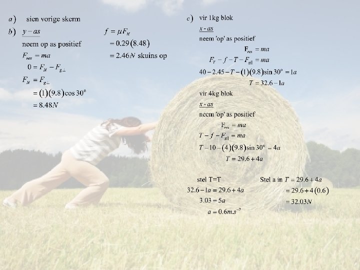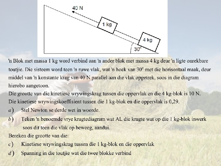 NORMAALKRAG Die krag (of komponent van ‘n krag) wat ‘n oppervlakte op ‘n voorwerp waarmee dit in kontak is, uitoefen Loodreg op oppervlakte GEWIG Gravitasie aantrekkingskrag van die aarde op ‘n voorwerp
