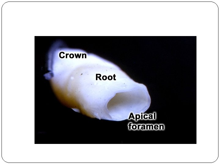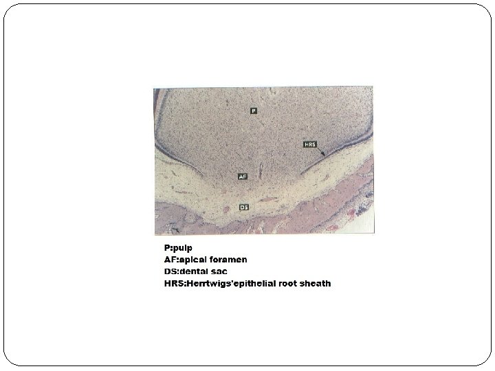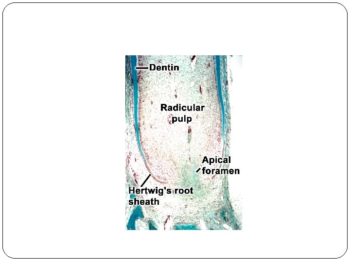�In the last stages of root development, the proliferation of the epithelium in the diaphragm lags behind that of the pulpal connective tissue. The wide apical foramen is reduced first to the width of the diaphragmatic opening itself and later is further narrowed by apposition of dentin and cementum to the apex of the root. Differential growth of the epithelial diaphragm in multi- rooted teeth causes the division of the root trunk into two or three roots.