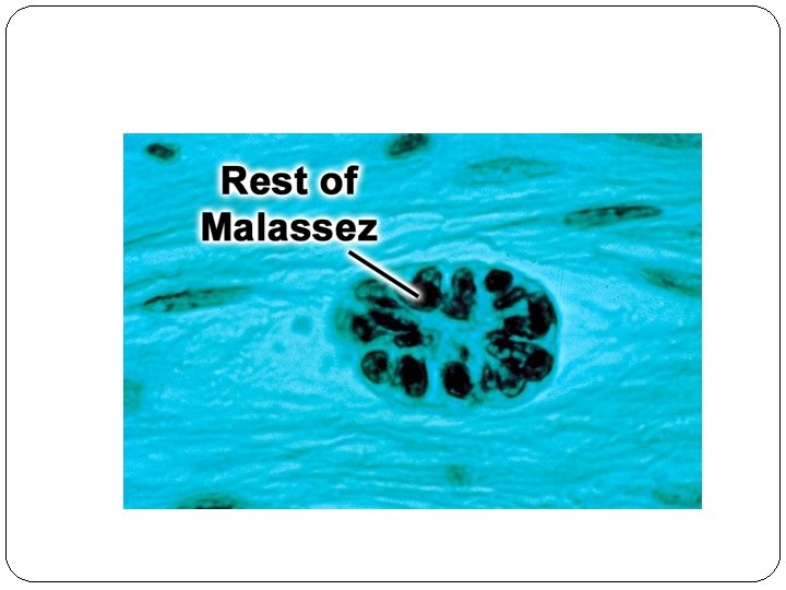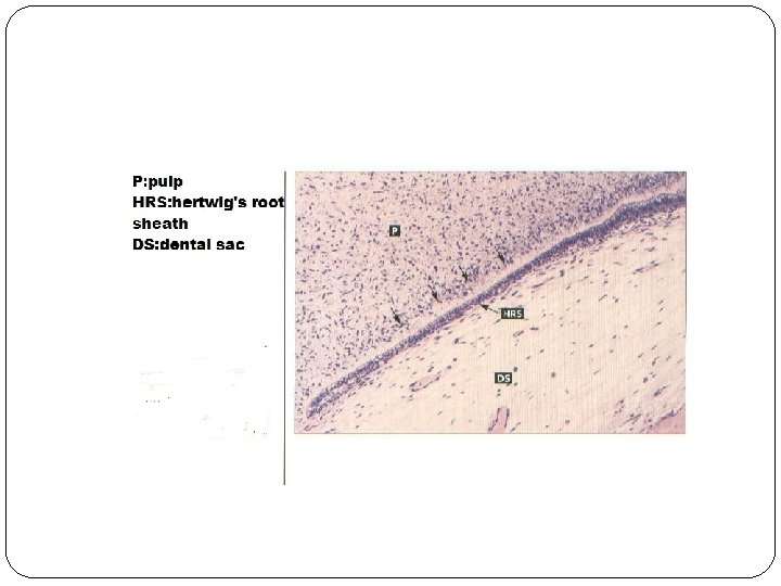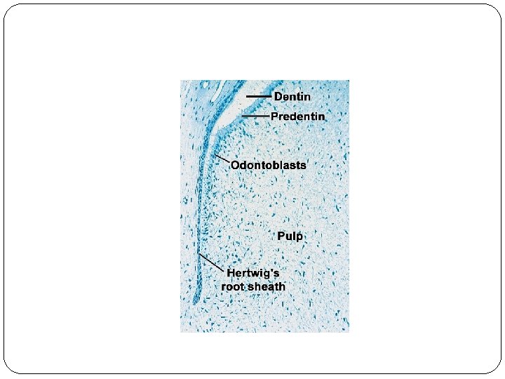 �When these cells have induced the differentiation of radicular dental papilla cells into odontoblasts and the first layer of dentin has been laid down, the epithelial root sheath loses its structural continuity and its close relation to the surface of the root. Its remnants persist as an epithelial network of strands or clumps near the external surface of the root. These epithelial remnants are found in the periodontal ligament of erupted teeth and are called rests of Malassez.