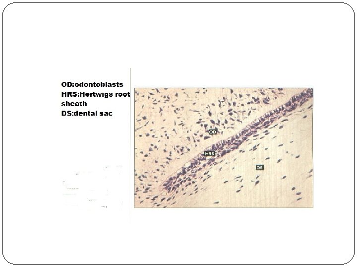 �The differentiation of odontoblasts and the formation of dentin follow the lengthening of the root sheath. At the same time the connective tissue of the dental sac surrounding the root sheath proliferates and invades the continuous double epithelial layer dividing it into a network of epithelial strands
