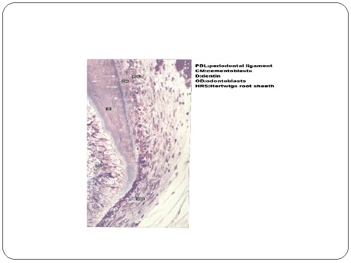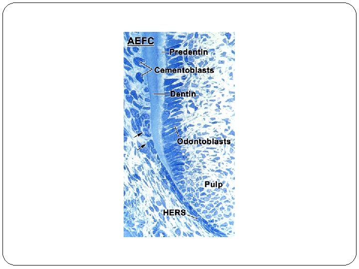 �The epithelium is moved away from the surface of the dentin so that connective tissue cells come into contact with the outer surface of the dentin and differentiate into cementoblasts that deposit a layer of cementum on the surface of the dentin. The rapid sequence of proliferation and destruction of Hertwig’s root sheath explains the fact that it cannot be seen as a continuous layer on the surface of the developing root.