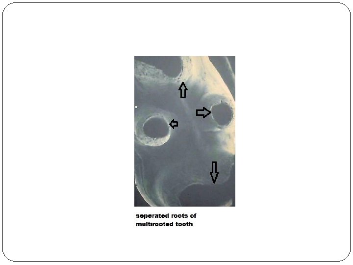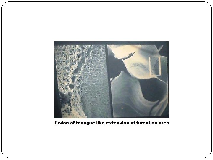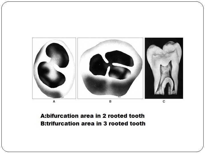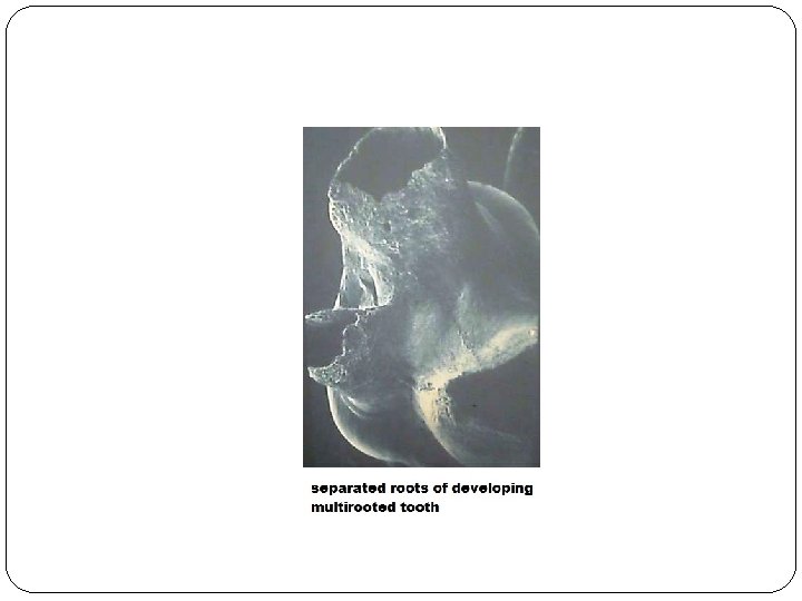 �Before division of the root trunk occurs, the free ends of these horizontal epithelial flaps grow toward each other and fuse. The single cervical opening of the coronal enamel organ is then divided into two or three openings. On the pulpal surface of the dividing epithelial bridges, dentin formation starts and on the periphery of each opening, root development follows in the same way as described for single-rooted teeth.