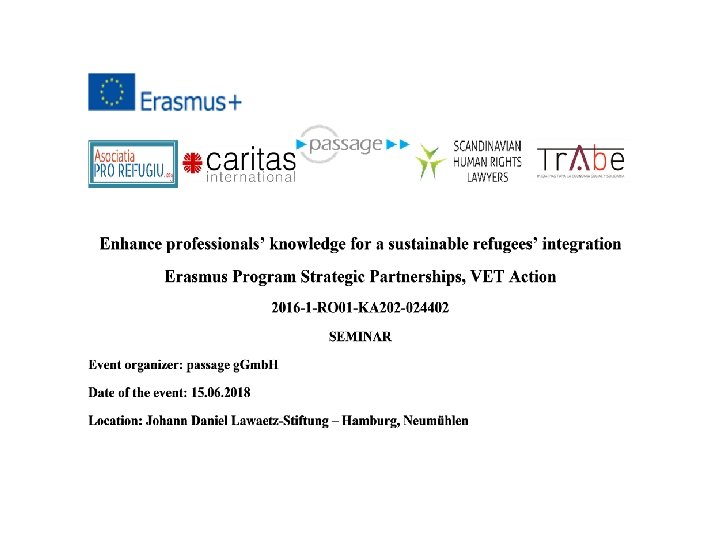 Erasmus+ http: //erasmusproject. refugeesintegration. prorefugiu. org/ Partnerschaft: Pro Refuguiu Association, Bukarest Caritas International, Brüssel Trabe Iniciativas para la Economia Social Y Solidaria, Madrid Scandinavian Human Rights Lawyers, Uppsalla Passage, Hamburg