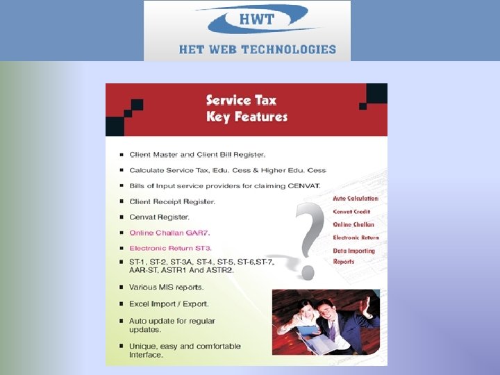 HET SERVICE TAX SOFTWARE For Managing Service Tax Compliance Het Service Tax is very easy, flexible and user-friendly Service Tax Management software that takes care of all your requirements relating to accounting and management of Service Tax. Ø Bills & Receipt Details Ø Cenvat Credit Details Ø Online Service Tax Challan ØElectronic Return Ø Service Tax Register Ø Import Bills / Receipts / Credit details Ø Used for Unlimited Companies