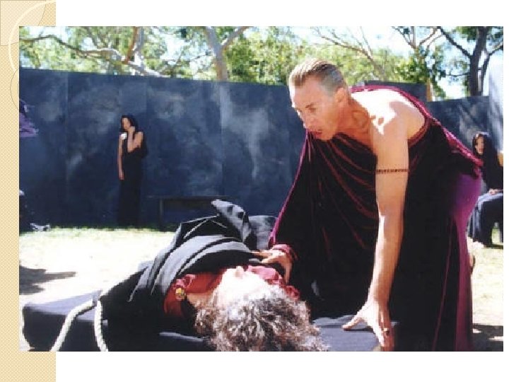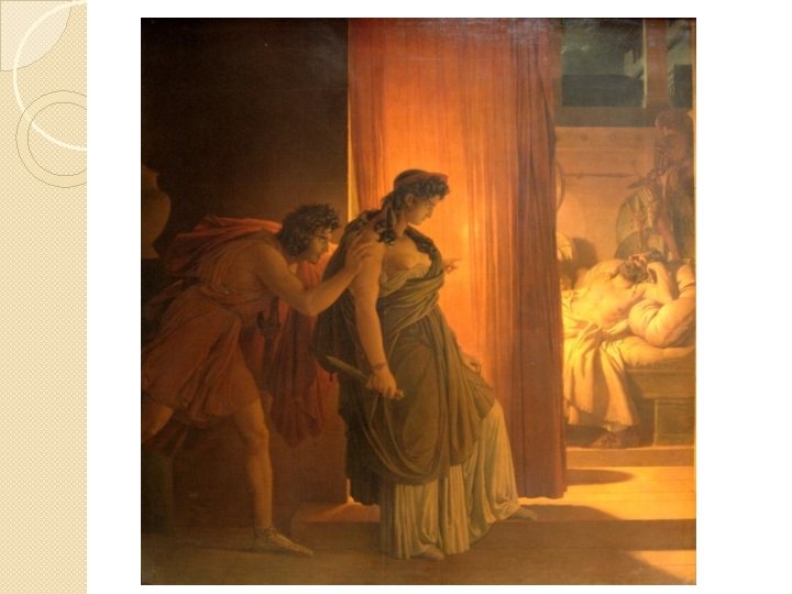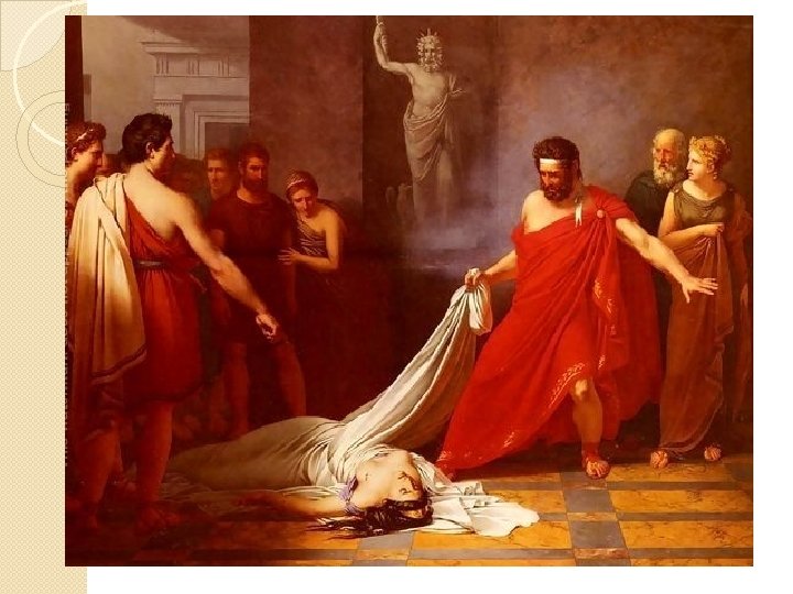 Intussen in Mykene… � Elektra en Chrysothemis hebben een vervelend leven, vol vernedering en haat. � Op een zekere dag wordt Chrysothemis naar het graf van Agamemnon gestuurd door haar moeder, Klytaimnestra. � Klytaimnestra heeft namelijk een droom gehad waarin Agamemnon opnieuw koning van Mykene werd en zij is daar zo van geschrokken dat ze meteen Chrysothemis met offergaven naar het graf van Agamemnon stuurt. � Elektra vindt dat Chrysothemis zich voor zulke klusjes niet moet lenen. Wraak is wat zij nodig hebben! Maar Chrysothemis is zachtaardiger en gelooft niet in wraak.
