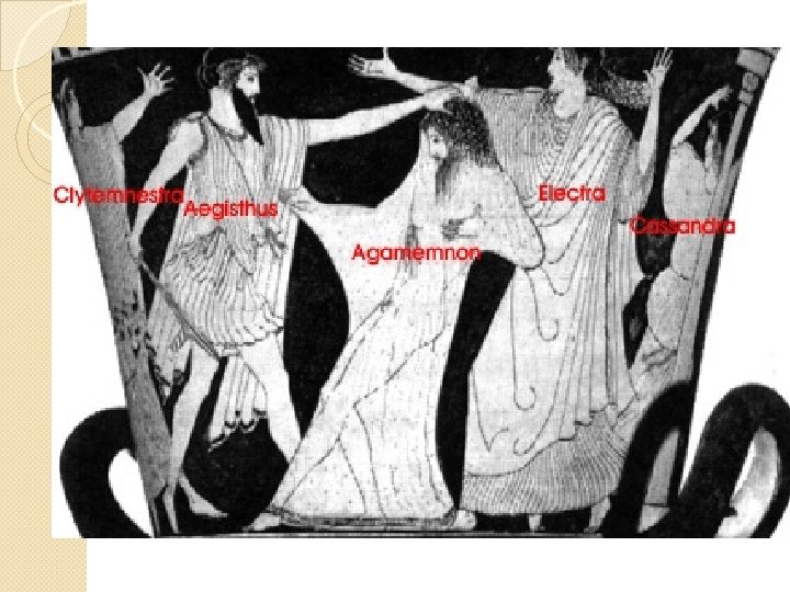 Klytaimnestra beschuldigt Agamemnon van de moord op haar dochtertje Ifigeneia; Elektra beschuldigt haar moeder van de moord op haar vader Agamemnon, samen met haar minnaar.
