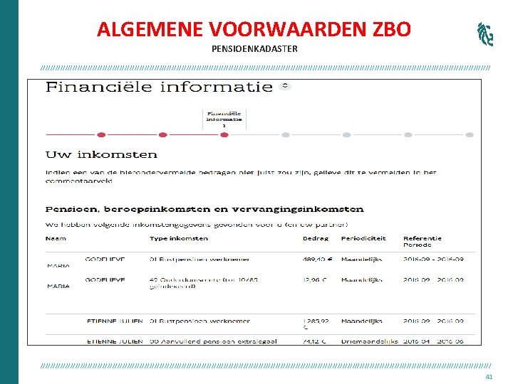 ALGEMENE VOORWAARDEN ZBO PENSIOENKADASTER /////////////////////////////////////////////////////////////////////////////////////////// > De volgende uitkeringen worden beschouwd als pensioenen: - de rustpensioenen en overlevingspensioenen van de werknemers - de rustpensioenen en overlevingspensioenen van de zelfstandigen - de rustpensioenen en overlevingspensioenen van de Nationale Maatschappij der Belgische Spoorwegen - de schadeloosstellingen, vergoedingen of pensioenen die ten titel van herstel of schadeloosstelling toegekend worden aan oorlogsslachtoffers of aan hun rechthebbenden - de pensioenen die toegekend worden bij toepassing van een buitenlands of internationaal verplicht pensioenstelsel - de rust- en overlevingspensioenen van een openbare dienst of gelijkgestelde (Staat, Provincie, Gemeenten, organismen van openbaar nut, …). > Andere uitkeringen in het pensioenkadaster > NIET te zien als “pensioen” voor het ZBO ook al worden zij samen met het pensioen uitbetaald. Vb. - het gewaarborgd inkomen voor bejaarden de inkomensgarantie voor ouderen de verwarmingstoelage de ouderdoms- en weduwerenten /////////////////////////////////////////////////////////////////////////////////////////// 40