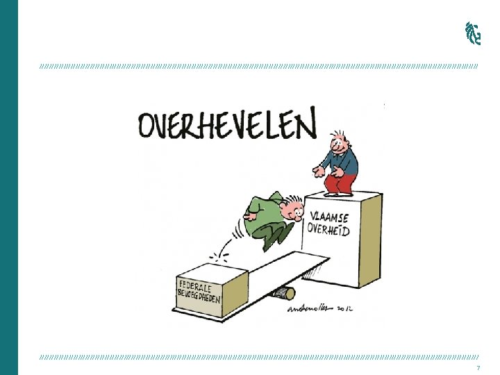 6 DE STAATSHERVORMING /////////////////////////////////////////////////////////////////////////////////////////// De Vlaamse Sociale Bescherming • Het zorgbudget voor zwaar zorgbehoevenden (vroeger de Vlaamse Zorgverzekering genoemd) sinds 2001 • Het zorgbudget voor mensen met een handicap of het basisondersteuningsbudget sinds september 2016 • Het zorgbudget voor ouderen met een zorgnood (vroeger de tegemoetkoming voor hulp aan bejaarden genoemd) vanaf 1 januari 2017 /////////////////////////////////////////////////////////////////////////////////////////// 13
